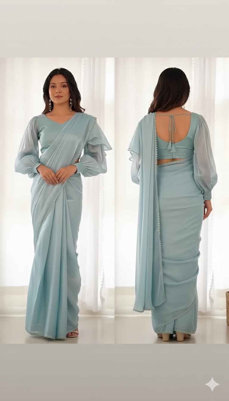 Ruffled Hemline: Adds volume and movement, enhancing the saree’s charm.