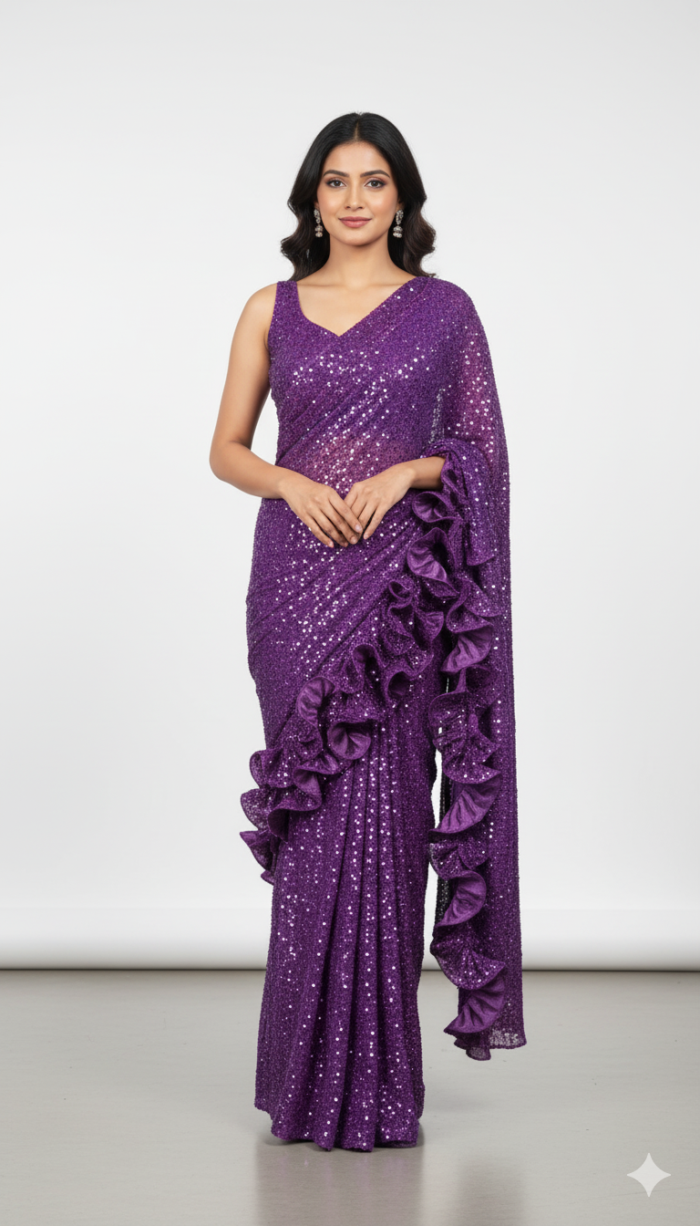 When draped as a saree, purple becomes even more enchanting. Its flowing fabric catches the light beautifully, creating graceful shadows and rich depth in every fold.